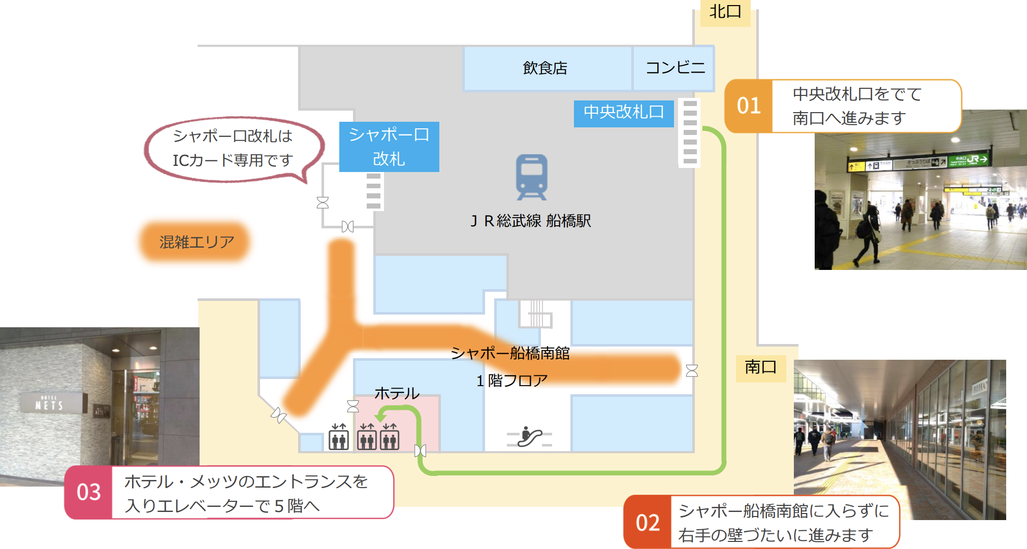 シャポー船橋南館1階のフロア内は混雑していることが多いため、ホテル・メッツのエントランスからお入りいただくと便利です。